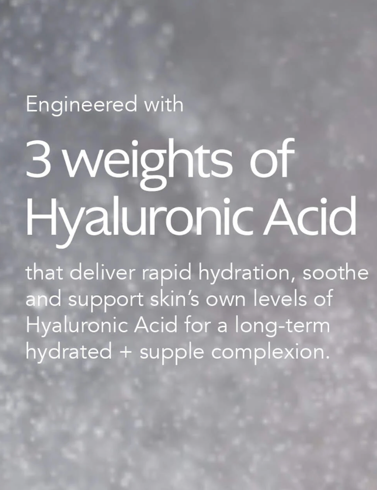 - Multi-Weight Hyaluronic Acid Complex: 3 molecular weights of hyaluronic acid deliver hydration, soothe and support skin’s own levels of HA for a long-term hydrated + supple complexion