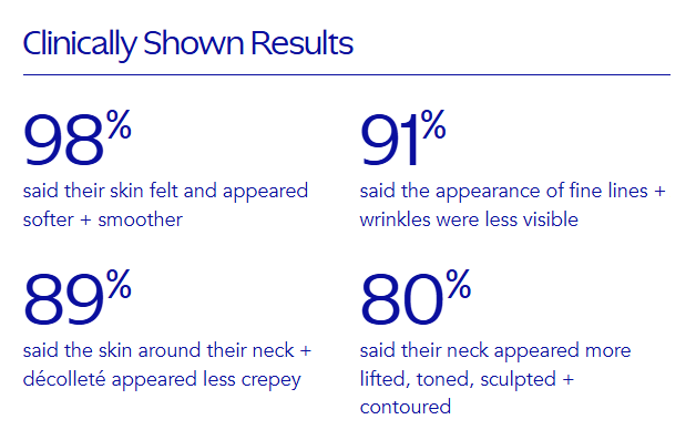 - Clinically shown to reduce the appearance of crepey skin, lines and wrinkles, especially deeper horizontal neck lines ('tech neck')